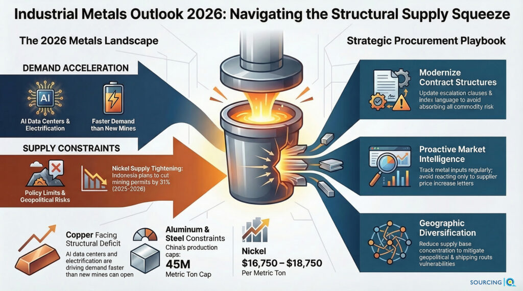 The industrial metals outlook for 2026 isn’t a “wait and see” situation for manufacturers. Copper, nickel, aluminum, and steel are all under structural demand pressure with constrained supply — and geopolitical disruption is adding a layer of volatility that purchasing teams can’t absorb through relationships and hustle.