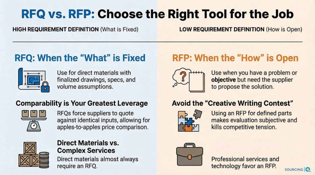 Use an RFQ when the specification is the answer to “what are we sourcing?”
