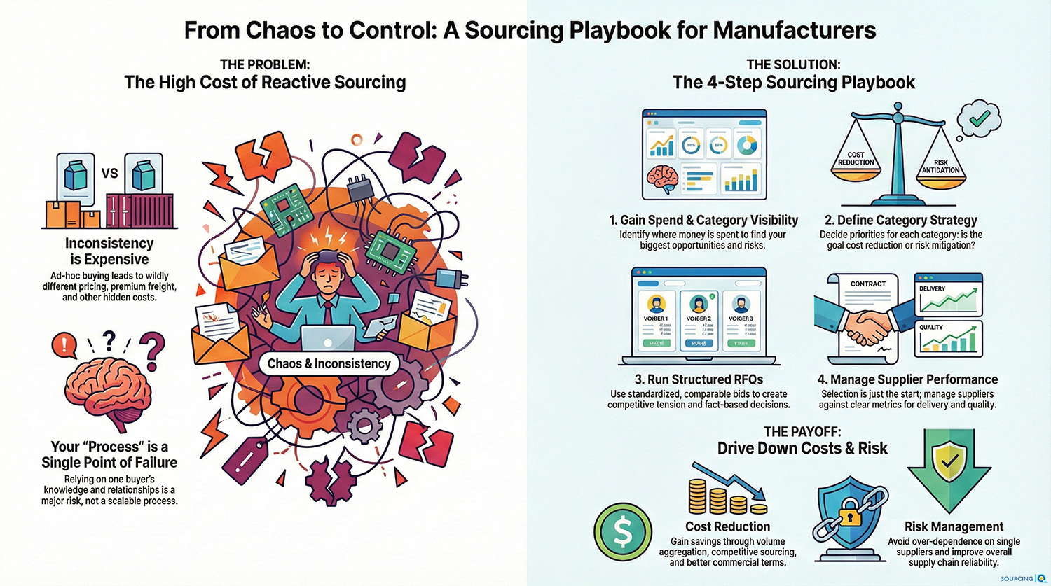 In manufacturing, sourcing isn’t an abstract business exercise. It directly affects production uptime, COGS, supplier reliability, and operational risk. Your strategy has to live in the real world, not in a generic procurement framework.